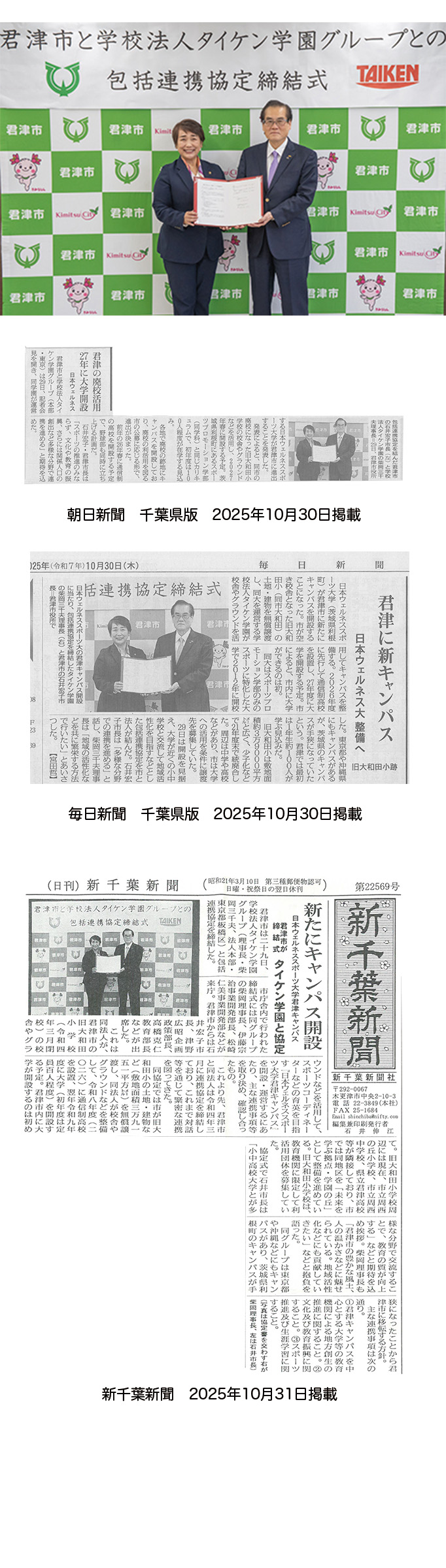 千葉県君津市と包括連携協定を締結 2025年10月29日、学校法人タイケン学園と千葉県君津市が包括連携協定を締結し、柴岡三千夫理事長と石井宏子市長が会見を行いました。 この協定は、市と学園が緊密に連携及び協力し、市の活性化と学園教育の向上を図り、相互の発展に寄与することを目的としています。 < 前の記事一覧へ戻る次の記事 >