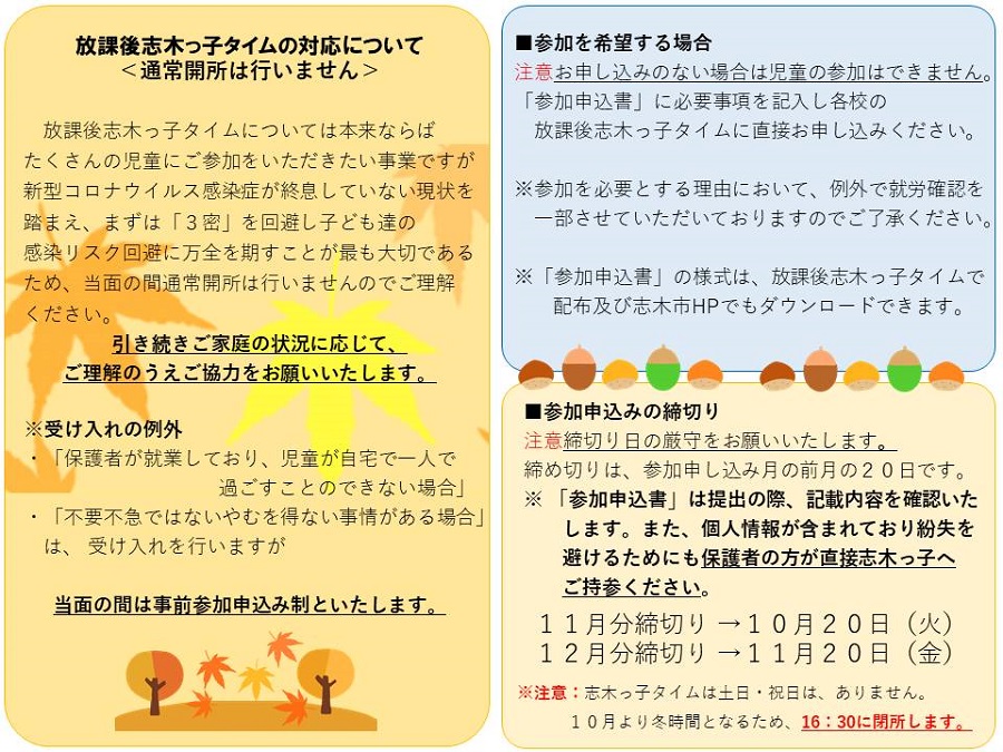 志木の木キンモクセイの香りが、どこからともなく漂い始めました。放課後志木っ子タイムは、当面の間、新型コロナウイルス感染拡大防止のため