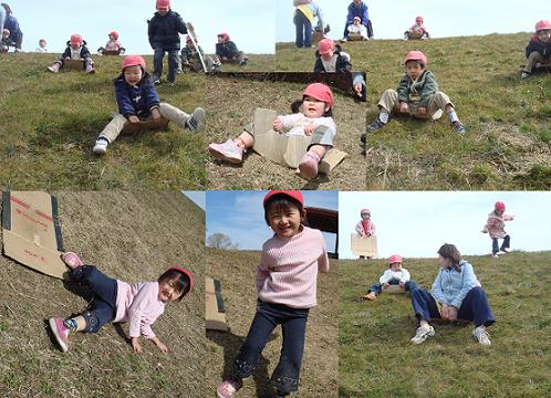 3月のふれあい遠足(大きい子)は田島公園に行ってきました。今日の目的は”ダンボールで自然のすべり台を満喫しよう!”でした。