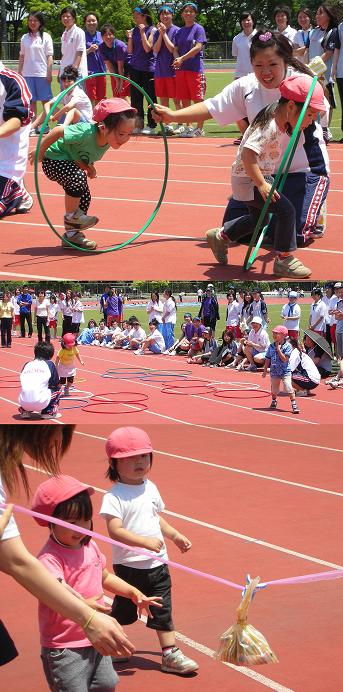 次はかけっこです。小さいお友達は輪をくぐったり、大きいお友達は「けんけんぱっ」と「でんぐり返し」最後はお菓子をとってゴール!!!