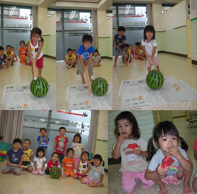 お知らせ一覧 すいか割り 保護者の方からスイカをいただきました(^o^)丿さっそくみんなでスイカ割り!スイカさんをスイカお化けに変身させてみんなでスイカお化けを退治しました。割れた後にはおいしくみんなでいただきました(^o^)「おいしいね~♪」と言ってるみんなの顔がとってもかわいかったです。 < 前の記事一覧へ戻る次の記事 >