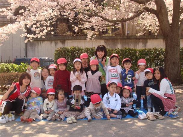 4月のお花見の写真です。桜の花の下で、みんなでおやつを食べました。