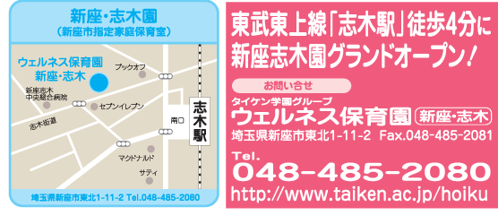 ウェルネス保育園の新座志木園がオープンしました。ただいま園児募集中です。お問合わせ、お待ちしています。