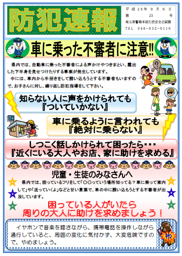 お知らせ一覧 埼玉県防犯速報第23号 自動車に乗った不審者が現れました。 県内では、自動車に乗った不審者による声かけやつきまとい、露出した下半身を見せつけたりする事案が発生しています。 中には、車内から手招きをして誘い込もうとする不審者もいますので、お子さんに対し、繰り返し防犯指導をして下さい。 本部 < 前の記事一覧へ戻る次の記事 >