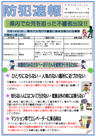 お知らせ一覧 埼玉県防犯速報第24号 9月14日(水)、県内で女児が不審者に身体を触られる事案が発生しました。 注意してください。 ・発生時刻:午後3時15分ころ ・発生地域:県西部 ・不審者の特徴:170センチ位、中肉、黒色Tシャツ、黒色ズボン、帽子、メガネ、黒色スマートフォン所持 ・事案の概要:女児が、男に身体を触られたもの。 ・発生時刻:午後4時45分ころ ・発生地域:県南部 ・不審者の特徴:30歳位、170センチ位、痩せ型、灰色Tシャツ、紺色ジーパン、灰色自転車利用 ・事案の概要:女児が、後方から自転車で近づいてきた男に身体を触られたもの。 本部 < 前の記事一覧へ戻る次の記事 >