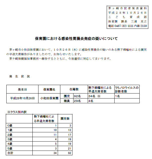 お知らせ一覧 感染性胃腸炎発症の疑い 神奈川県内の保育園で、感染性胃腸炎発症の疑いの園児多数が発生しました。 手洗い、うがい等の予防策を確実に実施してください。 調理師さん、気を付けてください。 詳細は下記茅ヶ崎市ホームページを参照 http://www.city.chigasaki.kanagawa.jp/koho/1002784/1020331.html 本部 < 前の記事一覧へ戻る次の記事 >