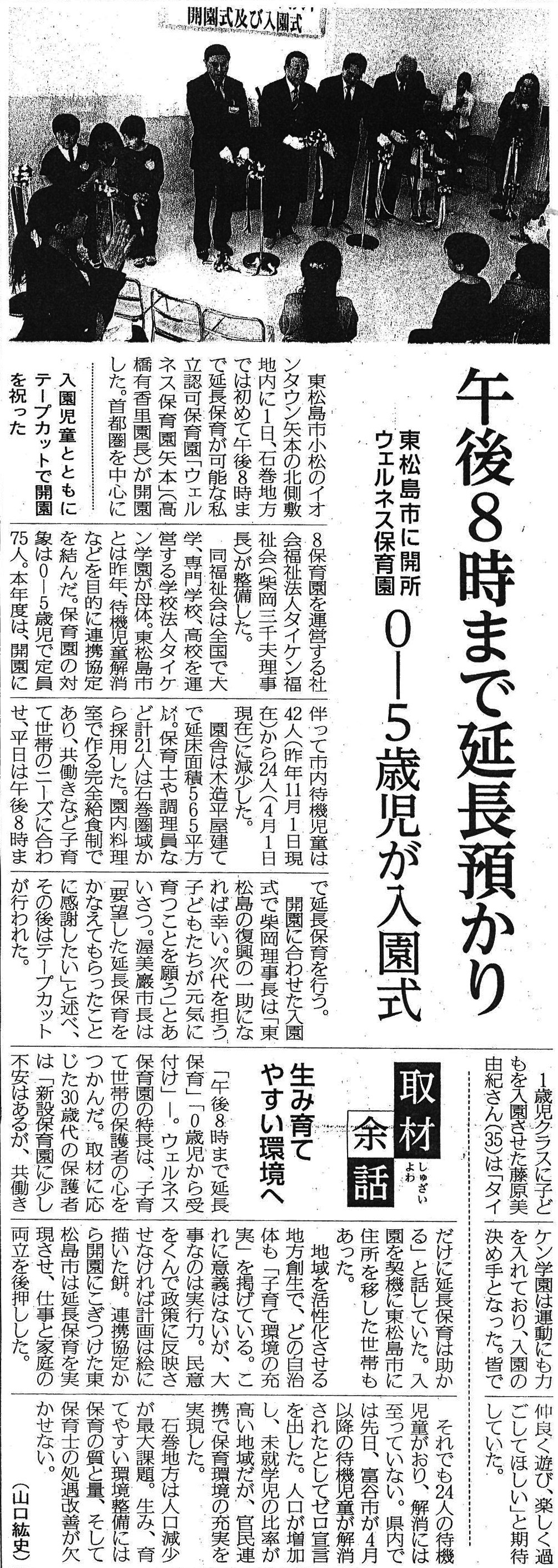 お知らせ一覧 ウェルネス保育園矢本 平成30年4月 開所 宮城県東松島市にウェルネス保育園矢本が平成30年4月1日に開所致しました。 石巻日日新聞にて、記事が掲載されました。 添付致しますので、ご覧くださいませ。 本部 < 前の記事一覧へ戻る次の記事 >