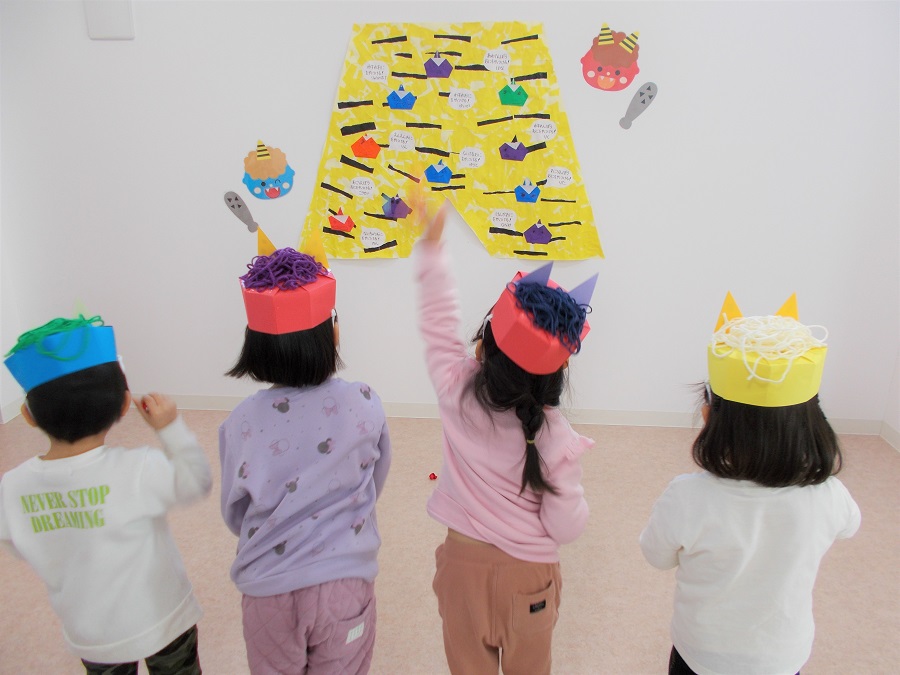お知らせ一覧 ウェルネス保育園 東松山(埼玉県) 2月2日(火)、節分の日。 みんなで豆まきゲームをしました。 クラスごとに、いろんな鬼を作って カラーボールや紙を丸めた豆で退治します! 「鬼は~外!福は~内!」 無事に退治できたかな? 豆まきの雰囲気を味わいながら、 楽しく節分を迎えることができました☆ < 前の記事一覧へ戻る次の記事 >