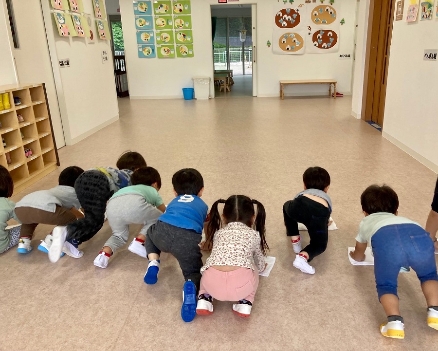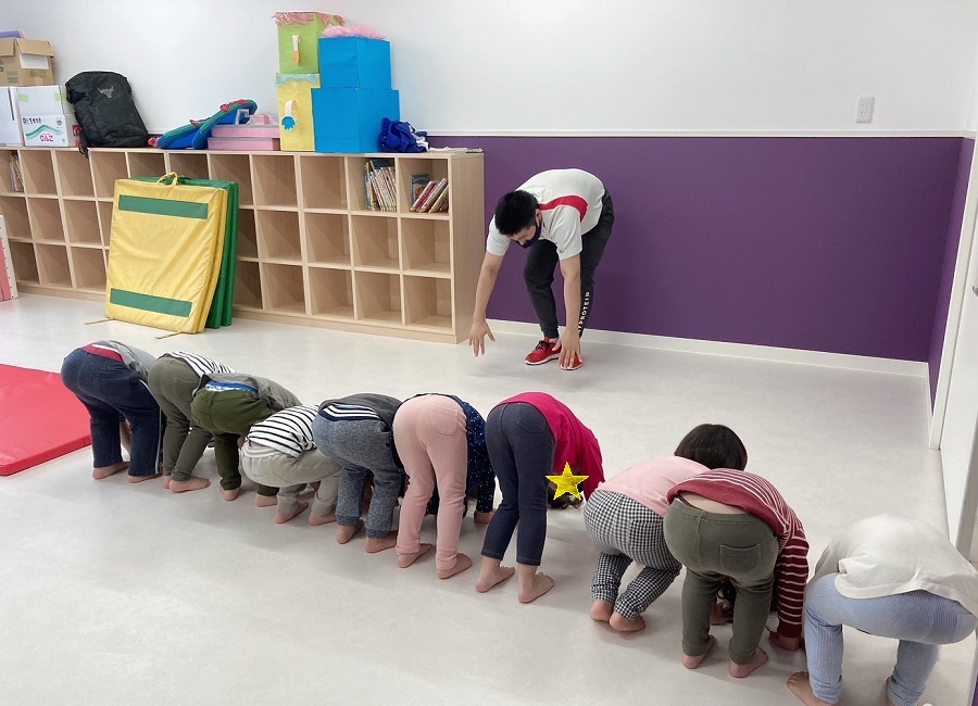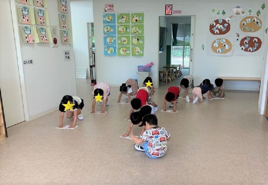 お知らせ一覧 ウェルネス保育園 東松山(埼玉県) 新年度がスタートして早2か月。 今年度も幼児体育指導がスタートしています。 3歳児クラスにとっては初めての幼児体育ですが 少しずつ慣れてきていますよ。 まずは並ぶ練習から。 真っすぐ並べたかな? 次は、でんぐりポーズ! 前転の第一段階です。 4歳児と5歳児は、ブリッジの練習。 手の平を置く向きは正しいかな? 幼児体育は月に一度ですが、日々の雑巾がけを通して 体力や筋力を付けると共に、生活の場を綺麗にするという 環境整備の意識も育んでいます。 いつも綺麗にしてくれて、ありがとう♪ < 前の記事一覧へ戻る次の記事 >