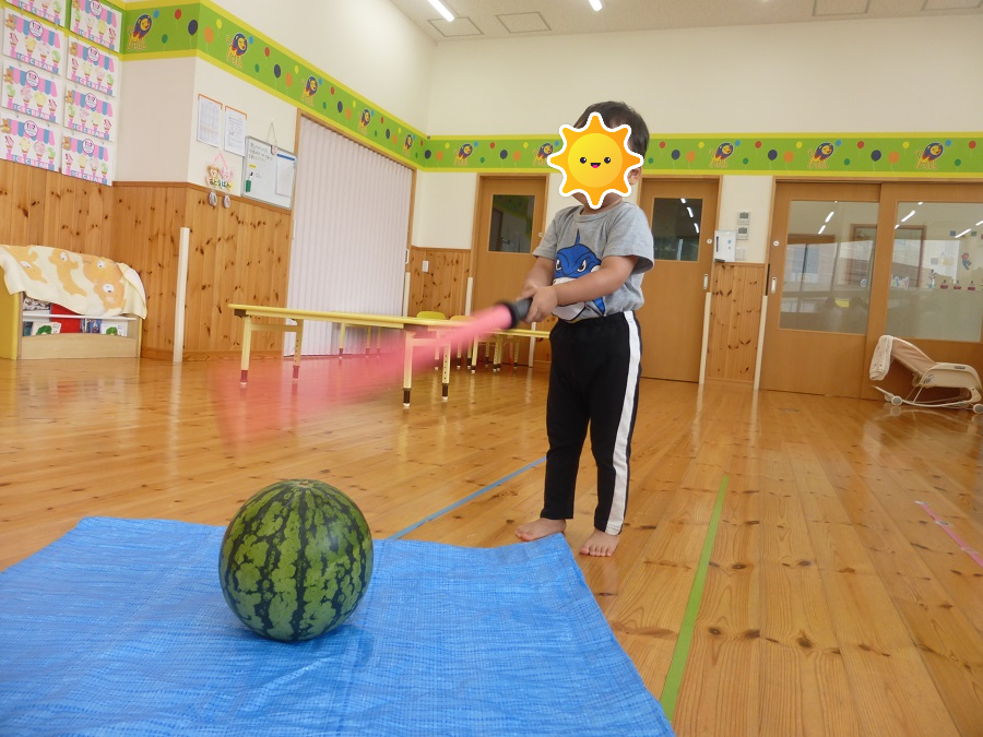 お知らせ一覧 タイケン福祉会事業所内保育 イオンゆめみらい保育園レイクタウン(埼玉県) スイカ割り大会をしました☆ おっき~いと驚く子どもたち。 みんなでスイカを食べようと割るため挑戦! 周りのお友だちの「がんばーれっ!」の応援に合わせ、スイカをたたいていました! 「スイカは?」と保育士に何度も尋ね、早く食べたい様子。 おやつの時間にスイカが出てくると、大喜びでかぶりついていました。 子どもたちは暑さに負けずに元気よく日々の活動を行っており 保育室からは子どもたちの楽しそうな声が聞こえてくる毎日です。 < 前の記事一覧へ戻る次の記事 >