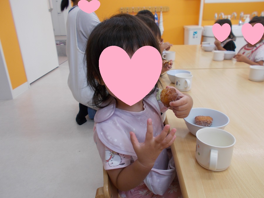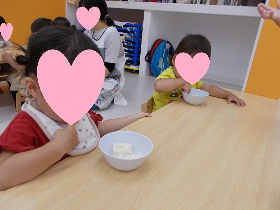 10月に行った食育活動を紹介します☆1歳児あひる組では、「豆腐つぶし」を行いました。