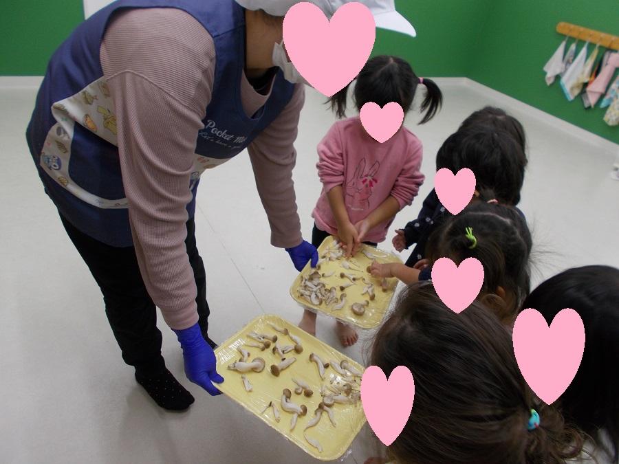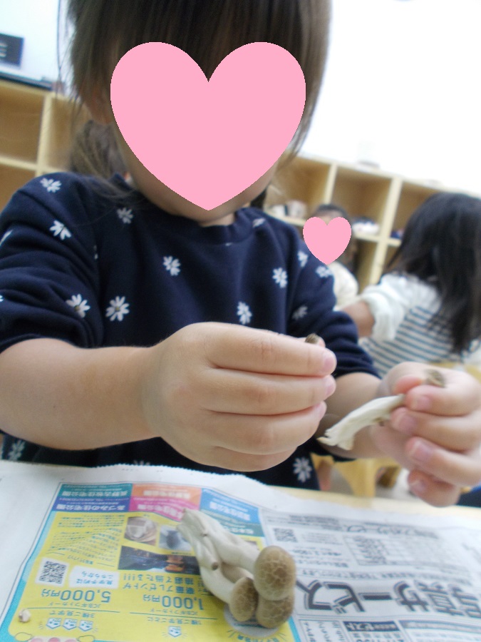2歳児ぺんぎん組では、しめじをほぐすお手伝いをしてもらいました。